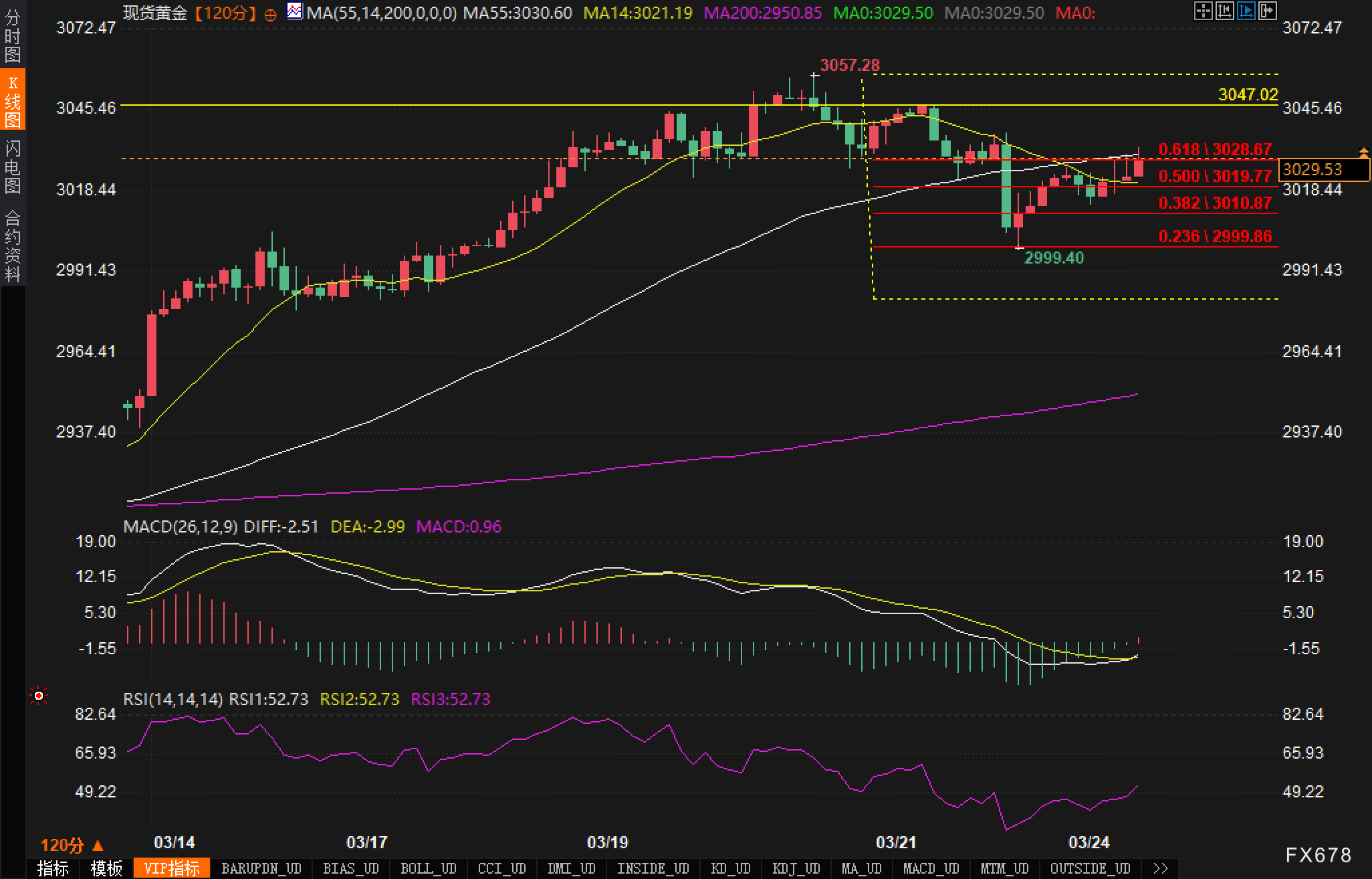 从2小时图表看,黄金价格在经历了急剧下跌后形成了一个明显的双底形态,最低点触及2999.40位置。目前价格已经反弹至3030水平,成功站上了关键的斐波那契0.382回调位3010.87,这是一个积极信号。MACD指标显示,尽管DIFF值为-2.51,但柱状图正在收敛,暗示下行动能正在减弱。RSI指标处于52.73左右的中性区域,没有显示出严重的超买或超卖状态,为价格提供了向上发展的空间。