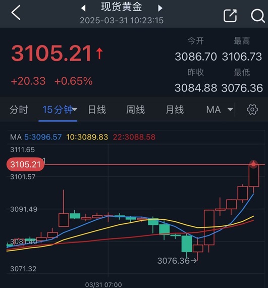 北京时间10:23,现货黄金报3105.21美元/盎司。