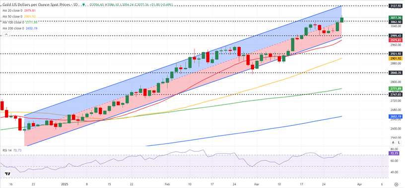 Sengezer指出,上行方面,随着金价突破短期阻力3100美元/盎司心理水平,金价将瞄准3130美元/盎司(长达四个月上行通道的上限)。一旦攻克后者,金价将看向3200美元/盎司(心理水平)。