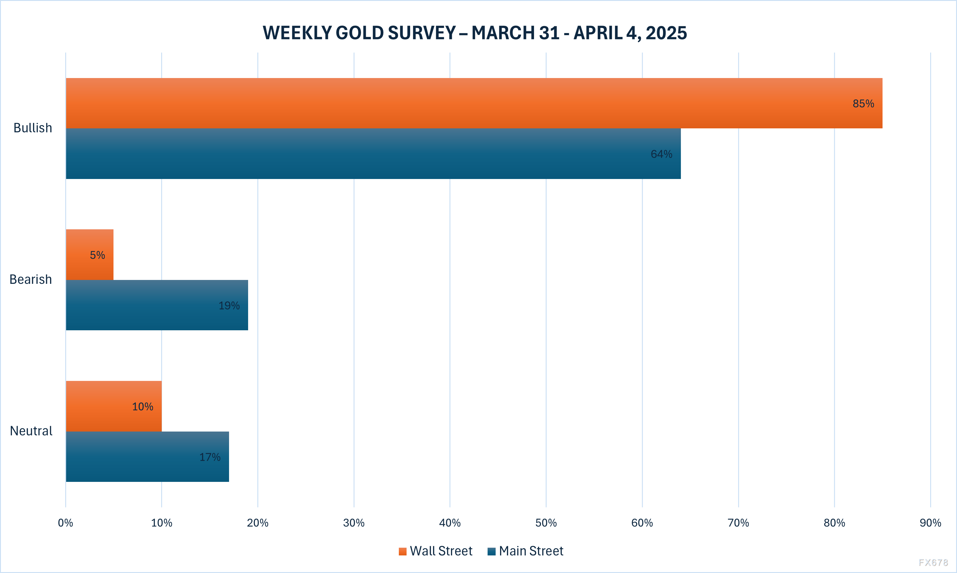 上周参与调查的20位分析师中,15位(85%)看涨未来一周黄金走势,仅1位(5%)看跌。在线投票的202位散户中,64%预计金价上涨,19%看跌。