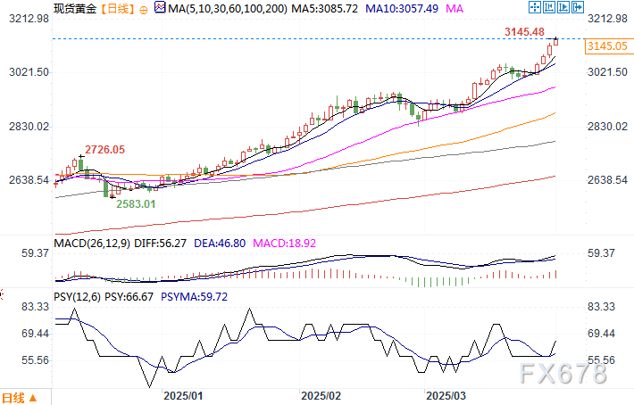 北京时间4月1日11:05 现货黄金 报 3145.05 美元/盎司
