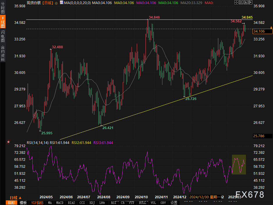 从日线结构观察,白银自去年8月8日低点26.45美元形成的上升趋势线,与34.87美元水平阻力线构成典型的上升三角形形态。该形态通常反映市场多空力量的暂时平衡,但当前价格已逼近形态末端,突破方向的选择迫在眉睫。