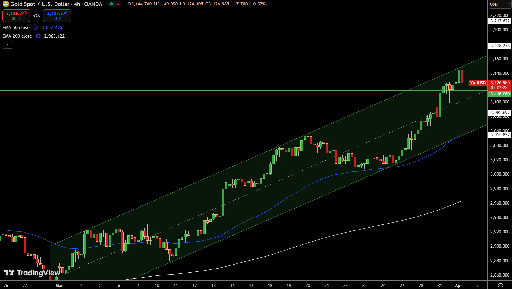 FXEmpire分析师Arslan Ali表示,金价在触及3149美元的新高后小幅回落,目前在4小时图上交易于3126.98美元左右。尽管有所下跌,但上升趋势仍保持在一个受人尊敬的上升通道内。