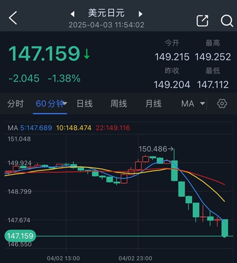 周四亚市盘中,美元/日元暴跌1.4%,报147.16,日内大跌205点。