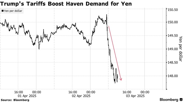 FX168财经报社(亚太)讯 周三(4月2日),美国总统特朗普公布“爆炸性”关税计划细节,引发市场避险情绪急剧升温。黄金价格大幅攀升,而在外汇市场上,日元成为最大的“赢家”,日元兑美元周四盘中暴涨超过200点。