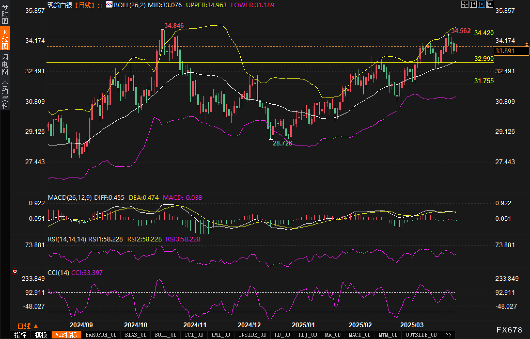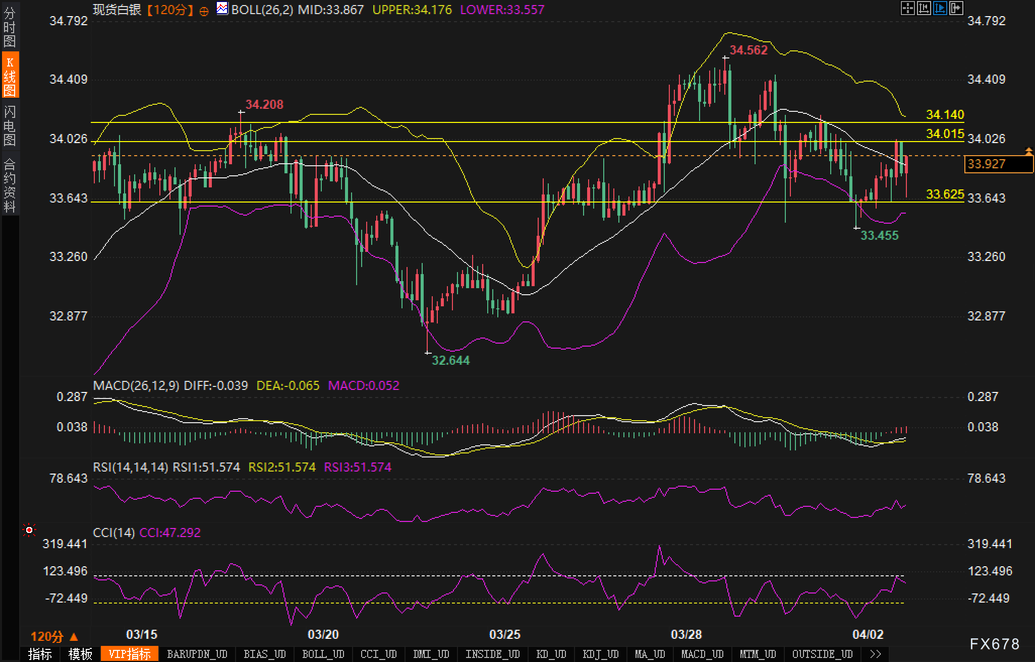 2小时图上,当前白银价格陷入33.26-34.40区间震荡,多空双方在关键位展开拉锯。从技术指标来看,MACD的DIFF与DEA间距收窄,显示空头动能有所减弱;RSI处于51.57的中性区域,CCI指标47.29同样未进入极端区域,反映市场整体处于观望状态。价格结构方面,33.26-33.64构成短期支撑带,34.14-34.40形成阻力区间,尤其需要关注34.41的突破情况。