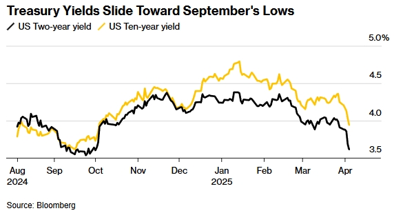 自上周三以来,投资者显然一直在债券市场避险,因为他们押注美国可能陷入经济衰退。在特朗普公布对美国贸易伙伴征收关税后,对政策敏感的美国国债收益率一度下跌逾0.4%。