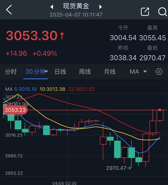 24K99讯 周一(4月7日)亚市盘中,现货黄金短线惊人暴涨,金价刚刚反弹至3053美元/盎司附近,较稍早触及的日内低点2970.47美元/盎司暴涨83美元。分析人士认为,逢低买盘成为金价反弹的主要因素。