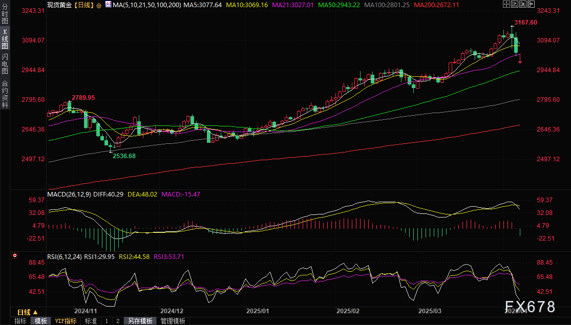 周一(4月7日)亚市早盘,现货黄金延续跌势,一度失守3000整数关口,刷新3月13日以来低点至2976.97美元/盎司,因国际贸易担忧情绪升温,美国股指期货继续大跌,日本、澳大利亚和新西兰股市也跟随跌势,投资者继续抛售黄金以弥补他们在更广泛的市场崩溃中的损失。上周五欧美股市大跌,投资者当时已经抛售黄金,导致现货黄金上周五大跌2.47%,收报3036.98美元/盎司。
