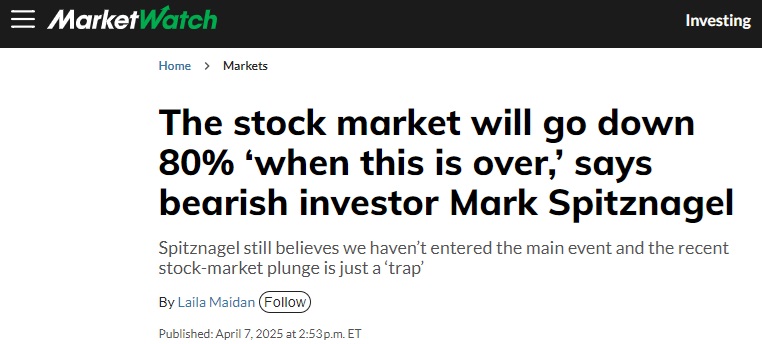 他在周一(4月7日)给MarketWatch的评论中写道:“当这一切结束时,股市将暴跌 80%。我只是不认为这就是结局。这是一个陷阱。”他并补充说,当真正的崩盘来临时,投资者会非常明确地感受到。