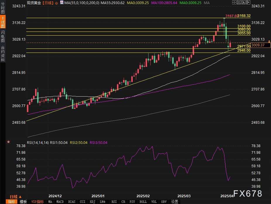 支撑确认:周一金价精准测试2955美元支撑后反弹,该位置对应3月中旬突破平台的颈线位,且与55日均线(2930美元)形成双重防线。日内低点买盘密集,表明中长期投资者视回调为建仓机会。