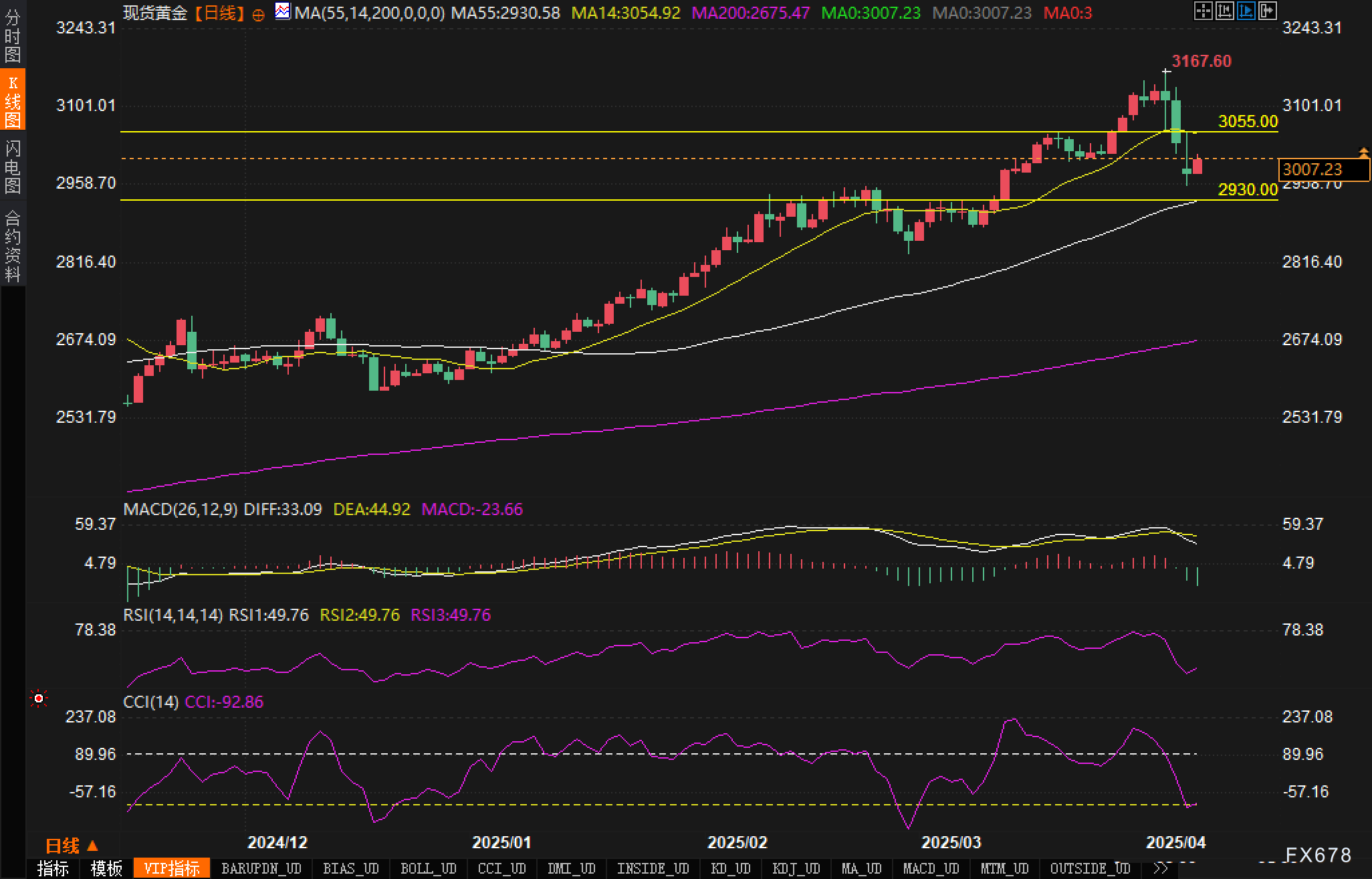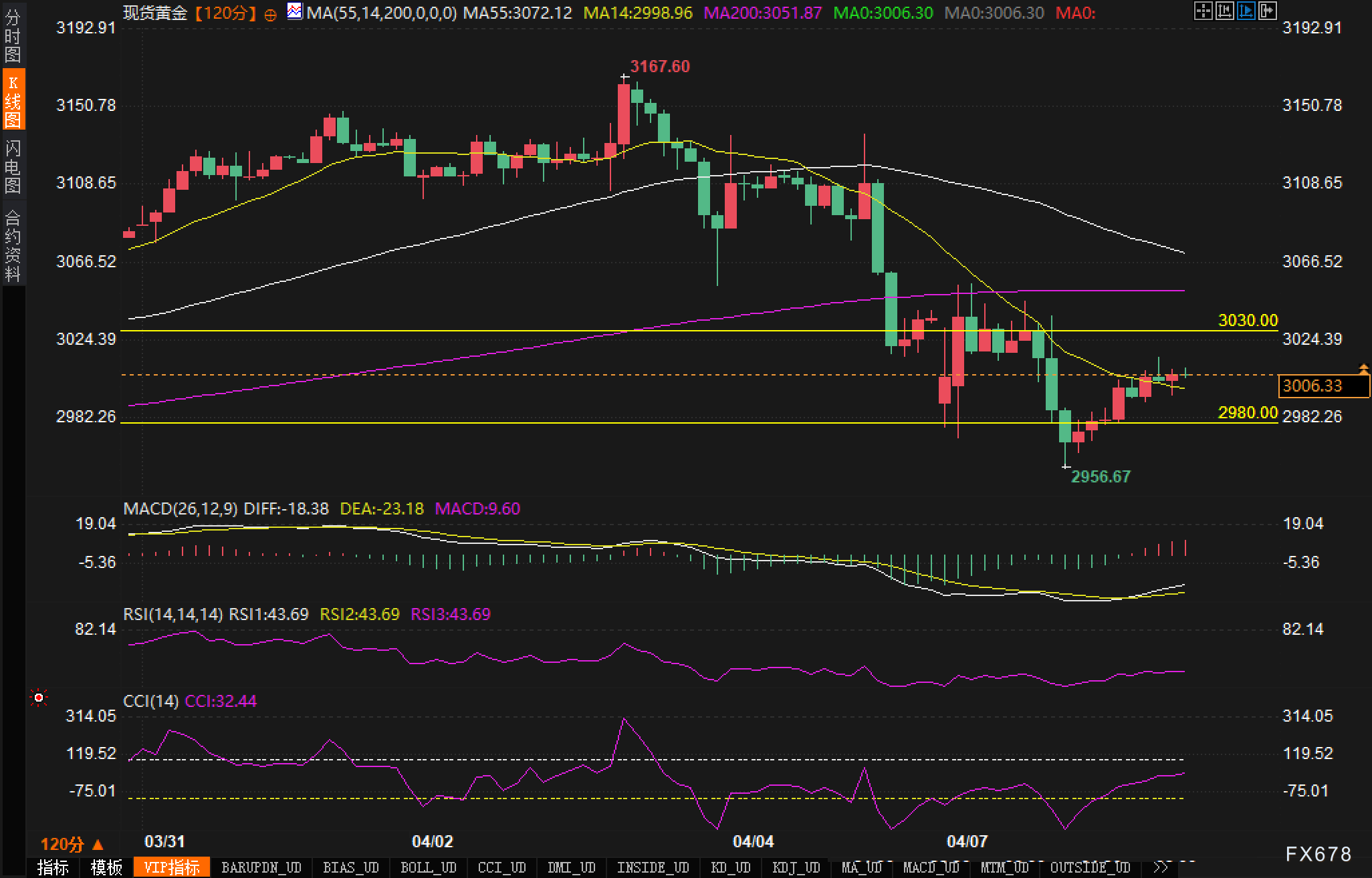 从120分钟图表来看,黄金经历了一波从3167.60美元高点至2956.67美元低点的明显调整行情。价格目前处于重要的3000美元心理关口附近,这一区域与MA14移动平均线(2998.96)形成了短期支撑。MACD指标目前显示DIFF:-18.38,DEA:-23.18,MACD:-9.60,MACD柱状图正在收缩,显示空头动能正在减弱。同时,RSI(14)指标当前读数为43.69,处于中性区域,但已经脱离超卖区间并有上行趋势。值得注意的是,MACD指标底部已经出现金叉迹象,这通常预示着短期反弹的可能性增加。此外,价格在2980.00附近形成了双底形态,这是一个潜在的反转信号。