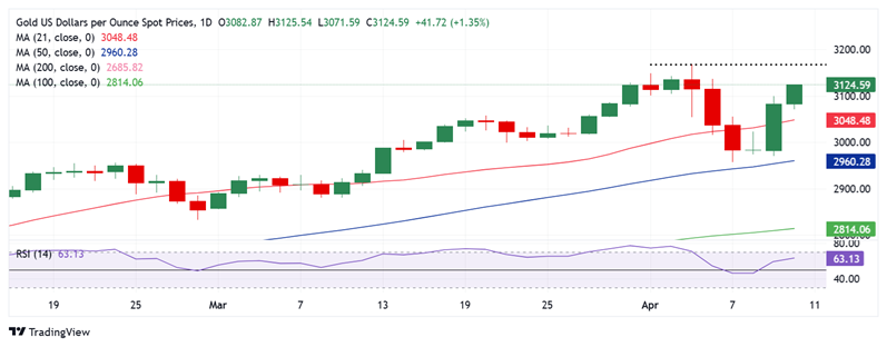 24K99讯 周四(4月10日)亚市盘中,现货黄金在上一交易日暴涨后再度大幅攀升,目前金价位于3129美元/盎司附近,日内暴涨近46美元。FXStreet高级分析师Dhwani Mehta撰文,对金价交易进行分析。