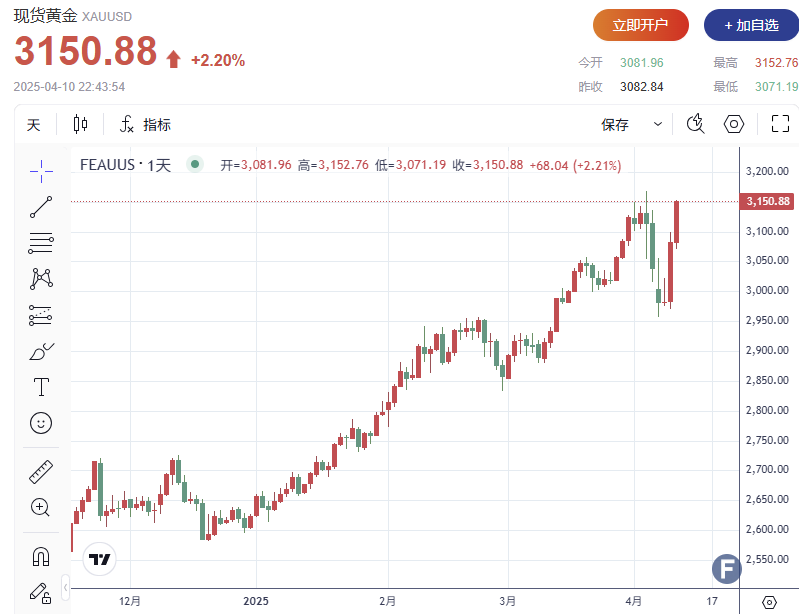 截至发稿,现货黄金上涨2.20%,报每盎司3,150.88美元,此前周三金价已大涨逾3%。