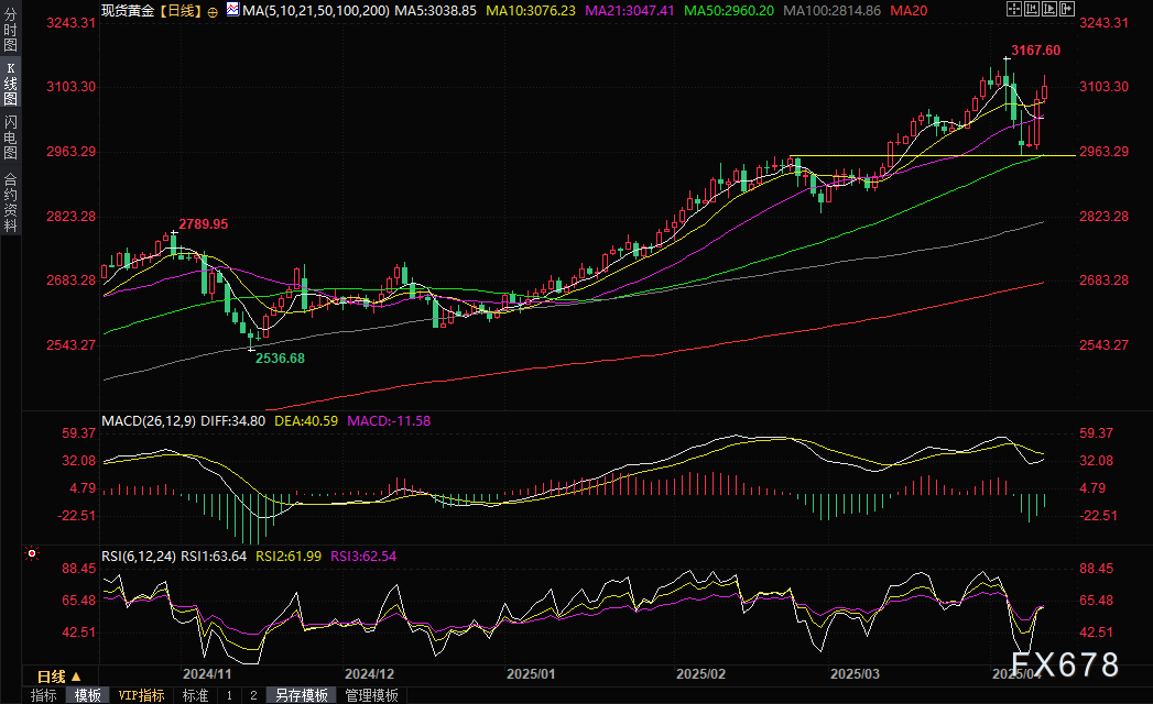 尽管特朗普宣布对其他国家的关税暂缓90天,但对华关税的激进加码直接导致全球两大经济体贸易战进入白热化阶段。Marex分析师Edward Meir预测,在"低增长+高通胀"的组合下,金价有望在月底前冲击3,200美元大关。