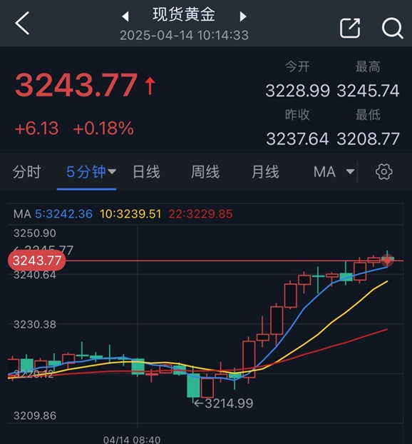 北京时间10:14,现货黄金报3243.77美元/盎司。