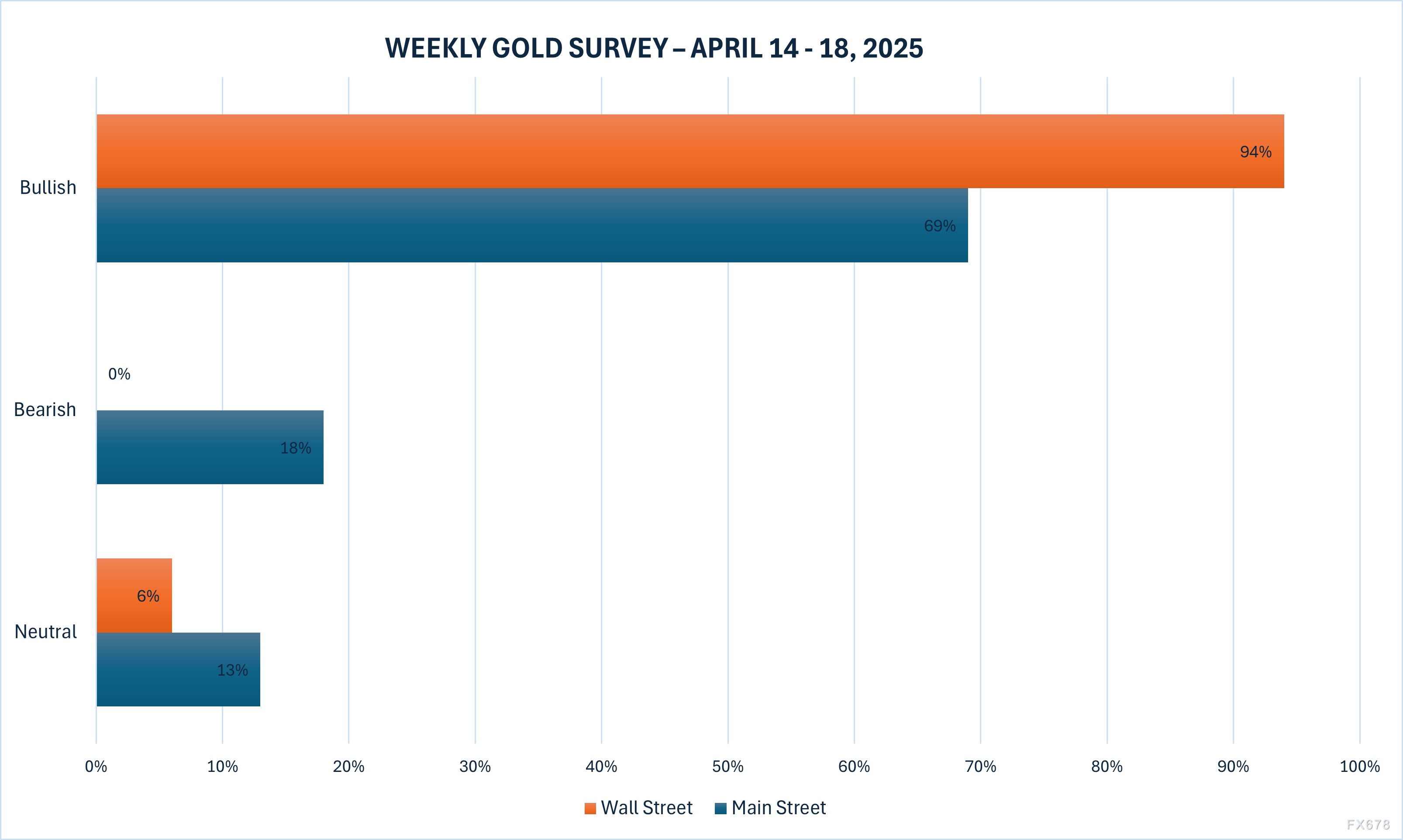 上周有16位分析师参与了Kitco新闻黄金调查,华尔街对黄金短期前景近乎一致看涨。15位专家(占比94%)预计未来一周金价将再次上涨,无人预测金价下跌。唯一持不同意见的分析师(占比6%)认为金价将在当前高位维持稳定。