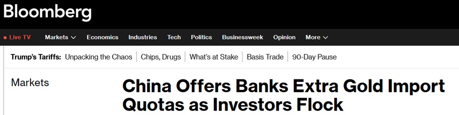 24K99讯 美国彭博社周一(4月14日)报道称,知情人士透露,中国央行已为一些商业银行发放新的黄金进口配额,以应对贸易战升级背景下机构投资者和散户投资者强劲的避险需求。