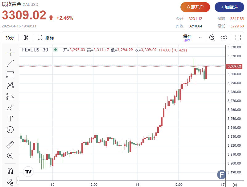 截至发稿,现货黄金上涨2.46%,报每盎司3,309.02美元,此前盘中一度触及历史高点3,317.90美元。