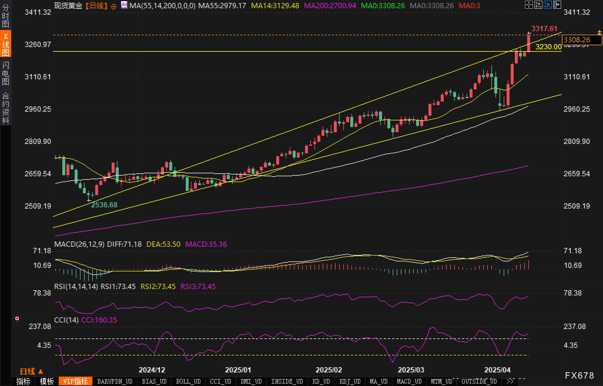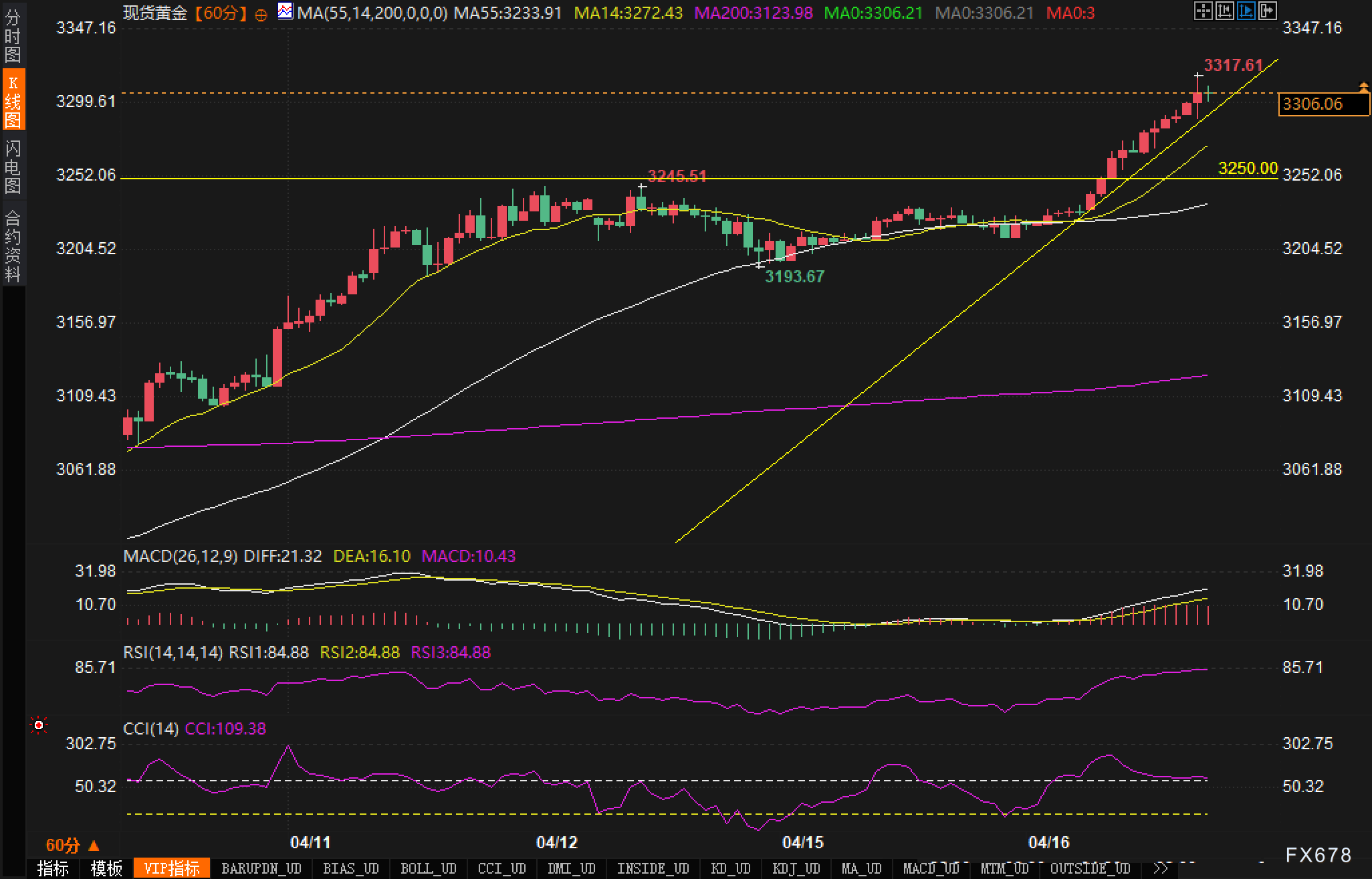 从60分钟图来看,黄金价格维持了强劲的上升势头,目前位于3300美元附近。价格形成了清晰的上升通道,并在近期加速突破3250.00美元的关键心理关口。MACD指标显示DIFF值为21.32,DEA为16.10,指示动能仍然偏向多方。值得注意的是,RSI指标读数达到84.88,已进入超买区域,暗示短期内可能面临一定的回调压力。