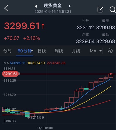 北京时间15:51,现货黄金报3299.61美元/盎司。