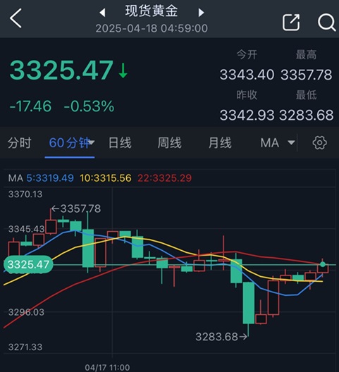 金价周四亚市盘初一度飙升至3357.78美元/盎司,创下历史新高。金价自上述高位持续回落,周四纽约时段盘中,金价一度暴跌至3283.68美元/盎司,创下日内低点。