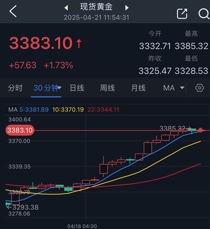 北京时间11:54,现货黄金报3383.10美元/盎司。