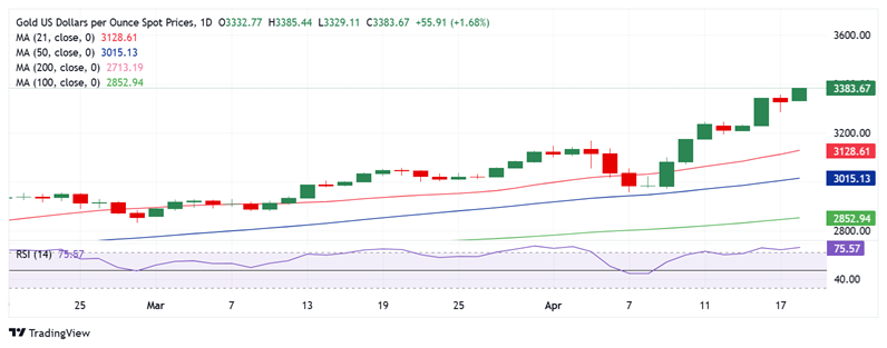 24K99讯 周一(4月21日)亚洲交易时段盘中,现货黄金价格暴涨,金价刚刚触及3385.32美元/盎司,创下历史新高,金价日内暴涨近60美元。FXStreet高级分析师Dhwani Mehta撰文,对金价交易进行分析。