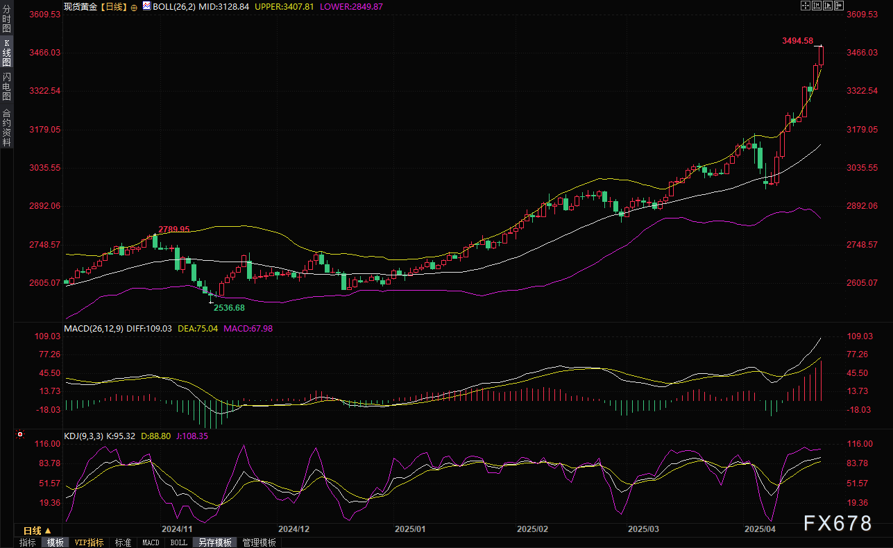 北京时间4月22日11:41 现货黄金 报 3493.22 美元/盎司