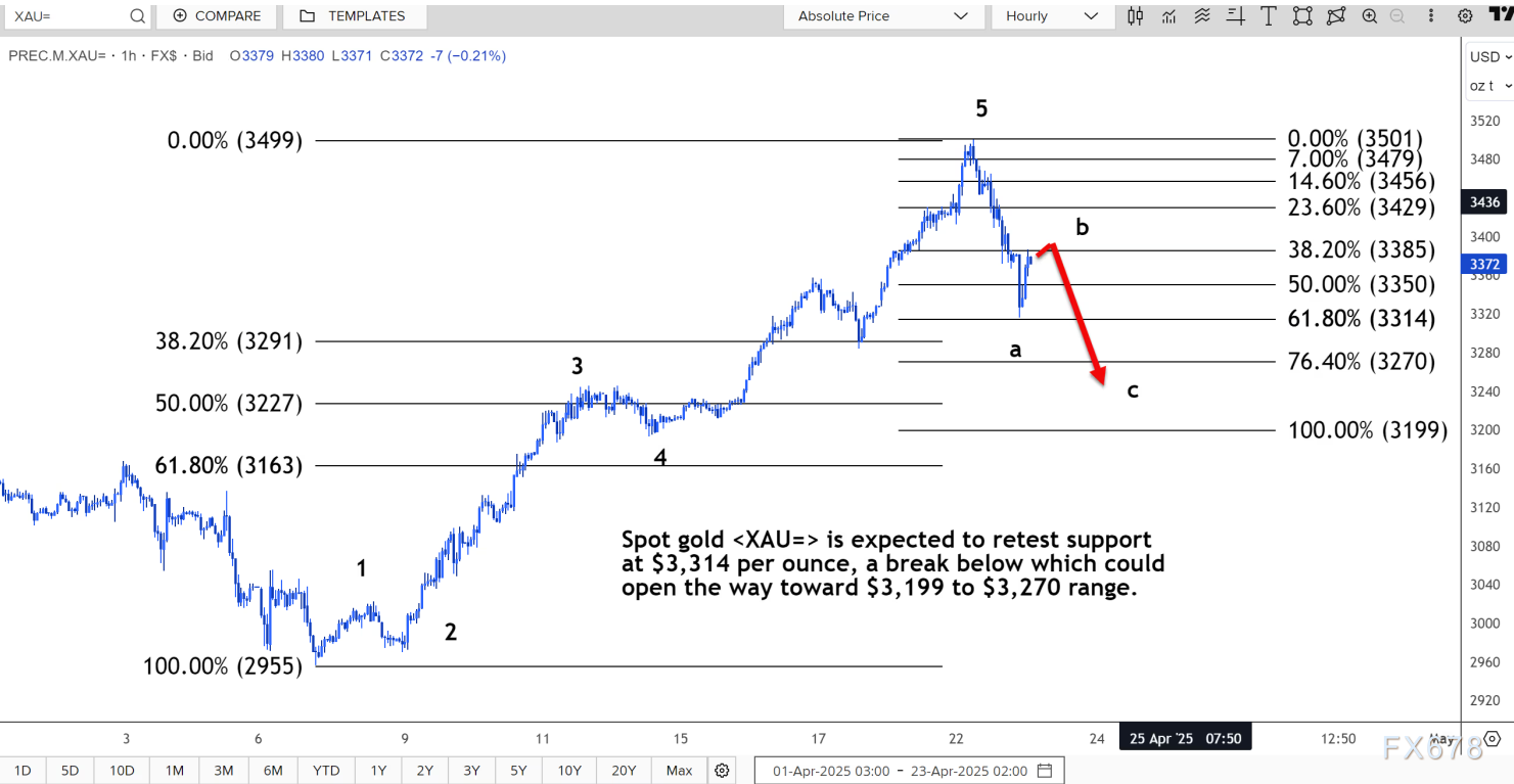 路透技术分析师指出。现货黄金预计将重新测试每盎司 3314 美元的支撑位,跌破该水平可能打开通往 3199 美元至 3270 美元区间的道路。