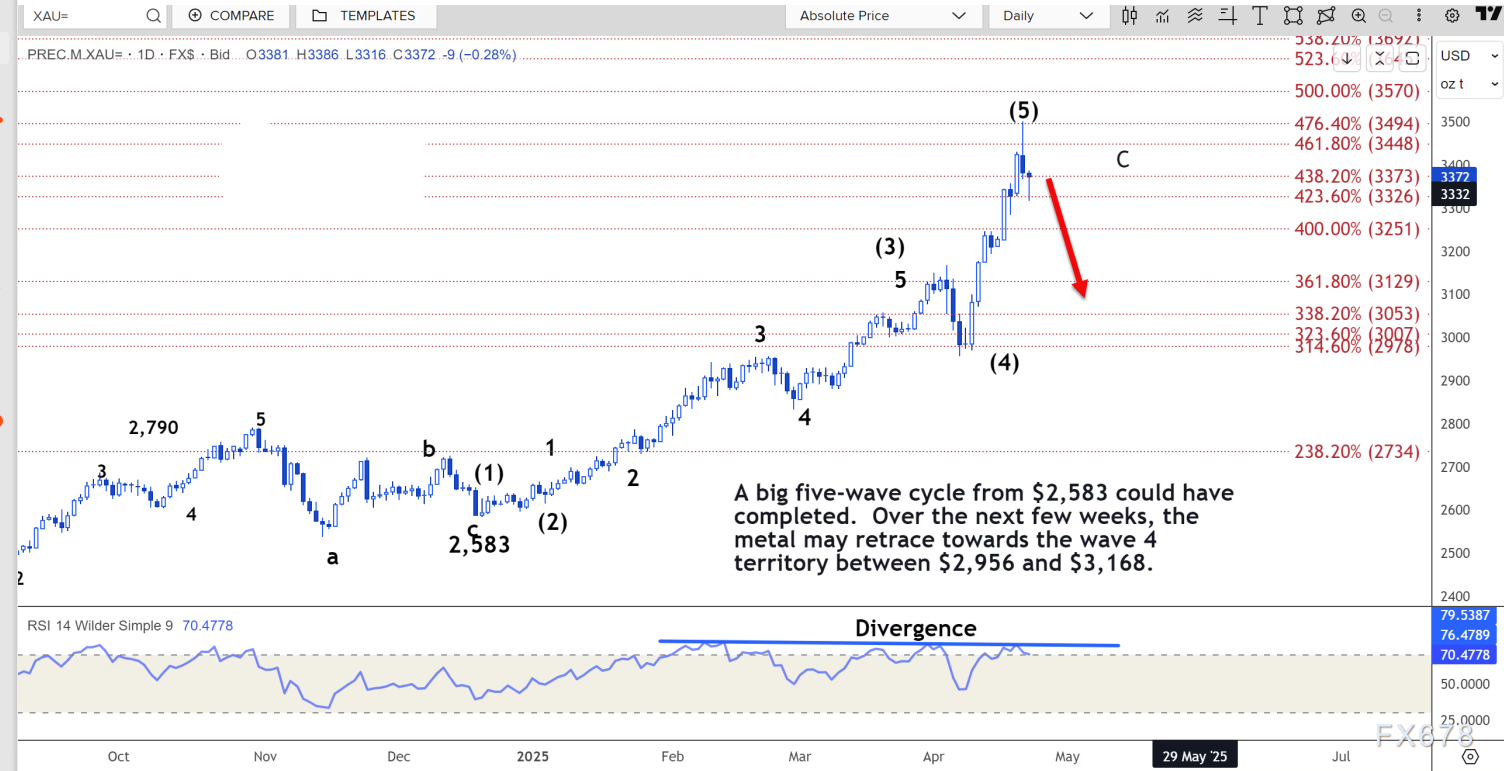 在接下来的几周内,金价可能会回撤至 2956 美元至 3168 美元之间的第四波区域。