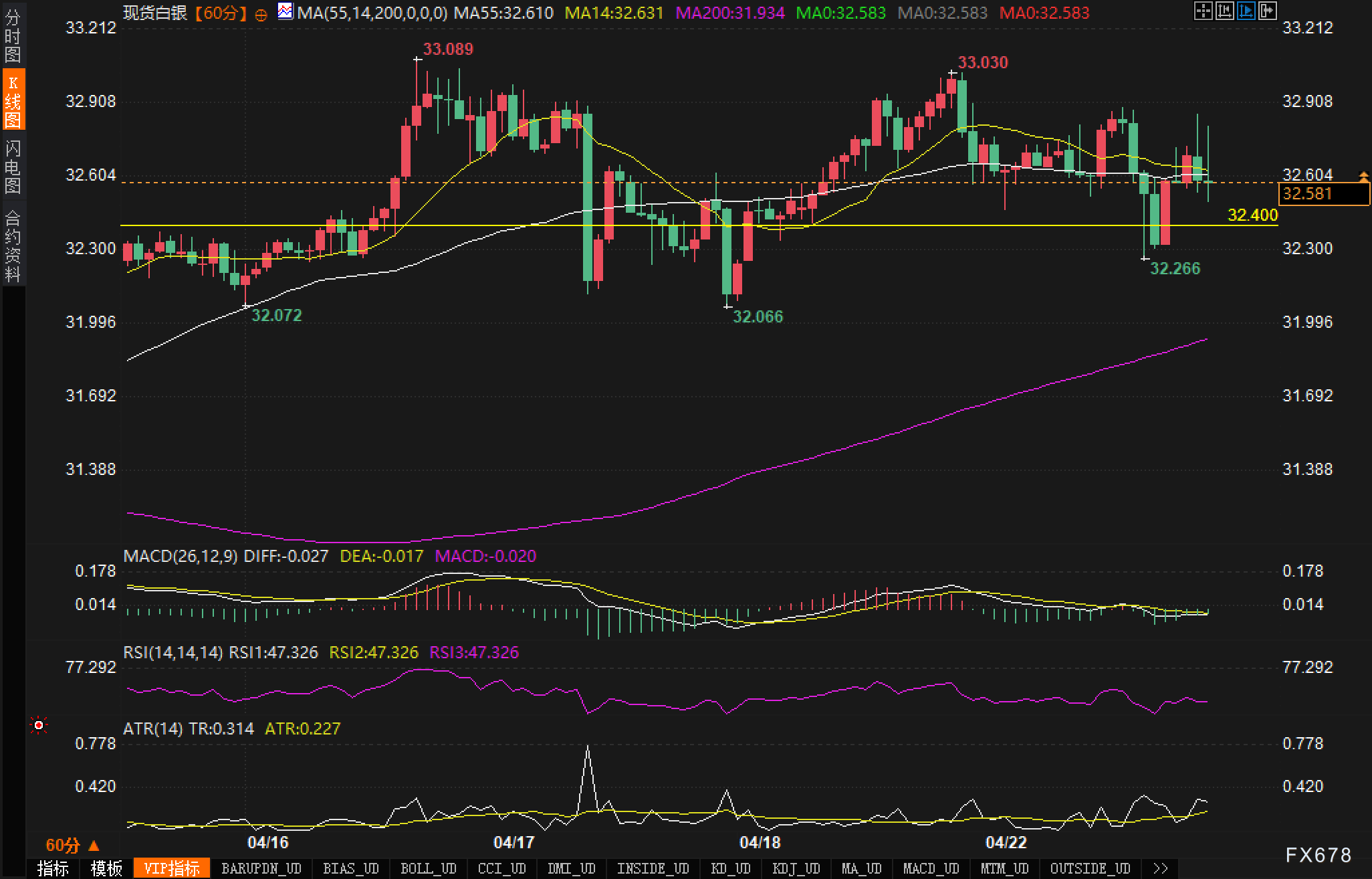60分钟图分析:从60分钟图表来看,现货白银目前交投于32.50美元附近,形成了一个关键的盘整区域。价格在32.400美元支撑位和32.800美元阻力位之间震荡。MACD指标显示DIFF值为-0.027,DEA值为-0.017,MACD值为-0.020,暗示短期动能略微偏弱。RSI指标值为47.326,处于中性区域,表明市场既没有超买也没有超卖。
