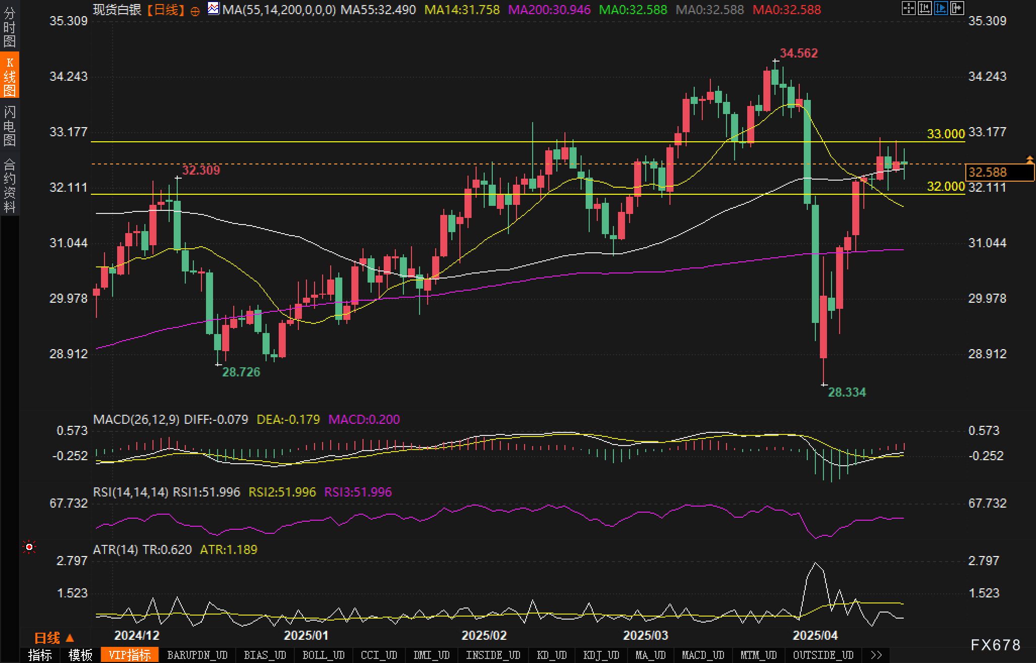 日线图分析:日线图显示,白银经历了从28.334美元低点到34.562美元高点的强劲上涨后,目前正处于调整阶段。当前价格位于32.50美元附近,处于32.000美元和33.000美元两个关键水平之间。MACD指标呈现出DIFF值为-0.079,DEA值为-0.179,MACD值为0.200的组合,这表明日线级别的动能可能正在积聚。RSI指标读数为51.996,略微偏多,但仍在健康区间内。