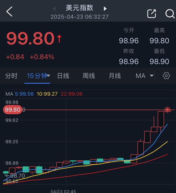 美元指数短线大幅攀升,目前触及99.80,日内涨幅达到0.84%。