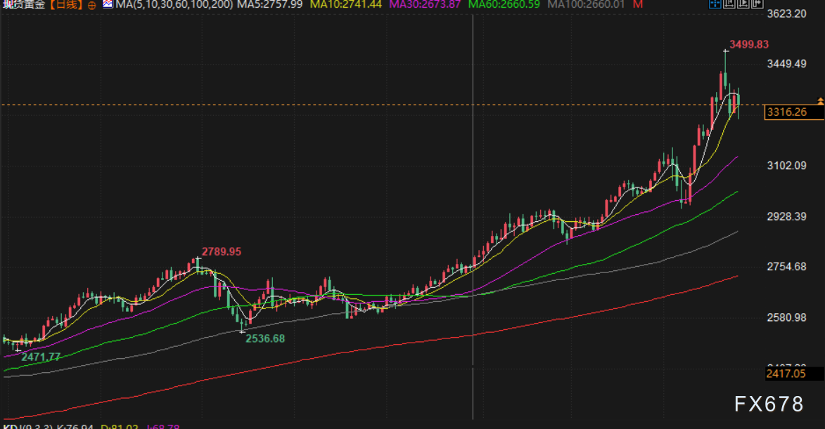 现货黄金周五下跌近1%,收于3316.26,金价本周虽然最后收于3300上方,但是本周金价的走势可谓是大起大落,日内的交易多次出现以近100美元的幅度在波动,市场在贸易紧张的局势下,避险情绪高涨,将金价一度推至3500上方。