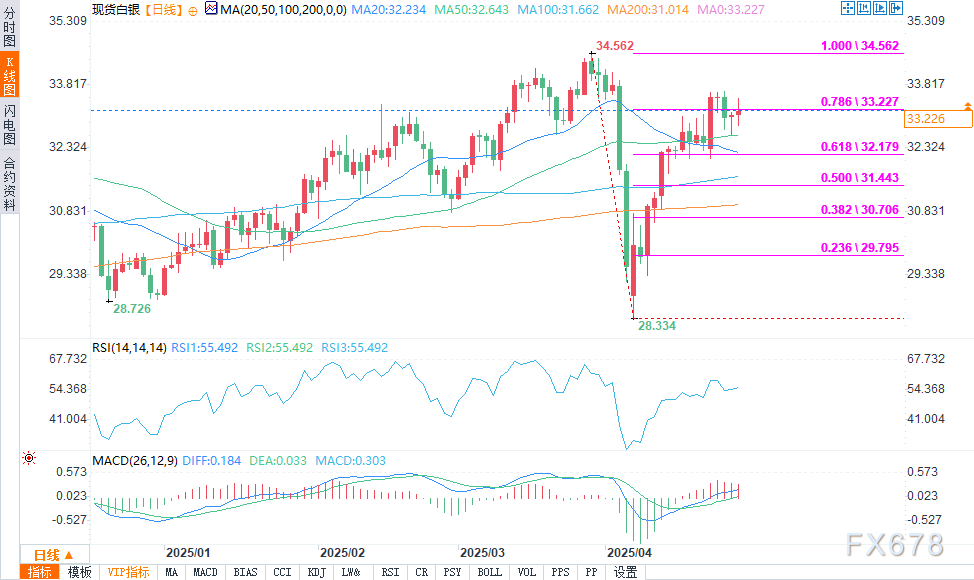 周二(4月29日)美盘时段,现货白银价格小幅反弹,盘中报33.277美元/盎司,涨幅0.44%。白银价格从上周五开始下跌,从33.70美元的高点滑落,获利回吐以及地缘政治局势的改善,削减了投资者对防御性资产的兴趣。目前关税前景变得扑朔迷离,白银价格反弹至33.70美元附近。目前,现货白银的交易价格接近一个关键支撑区间,市场的广泛关注点已转向即将公布的美国数据以及来自中国的宏观信号。