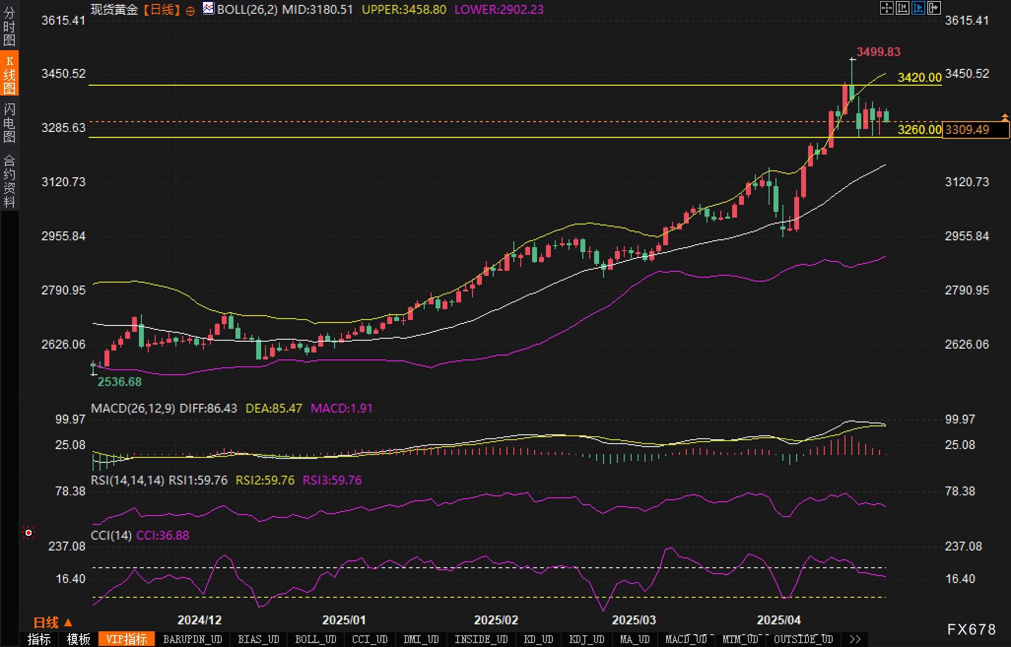 金价正处于关键技术位置,日线图显示出明显的盘整态势。今年以来,金价形成了一个强劲的上升通道,价格在突破3260美元重要阻力位后持续攀升,最终在4月冲击3500美元心理关口。目前,布林带上轨位于3458.80美元,下轨位于2902.23美元,中轨在3180.51美元附近提供中期支撑。