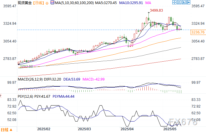 北京时间5月14日10:17 现货黄金 报 3236.76 美元/盎司