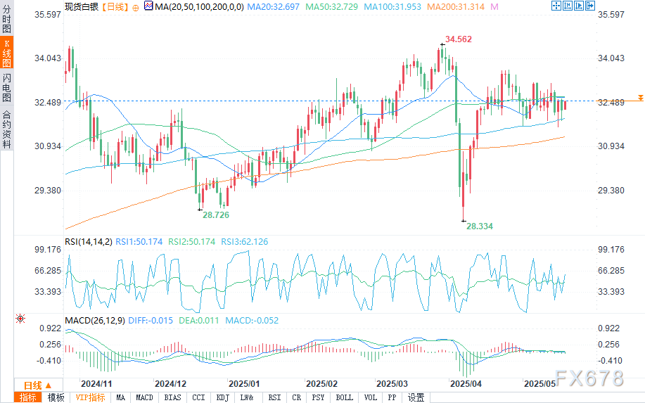 —周一(5月19日)欧盘时段,现货白银盘中涨幅近1%。白银价格本周以小幅上涨开局,坚定守住关键技术支撑位,同时美元走软和贸易紧张局势重现激发了避险需求。交易员正密切关注32.80美元水平,该价位与50日移动平均线重合,标志着可能向33.25美元和33.70美元突破的触发点。