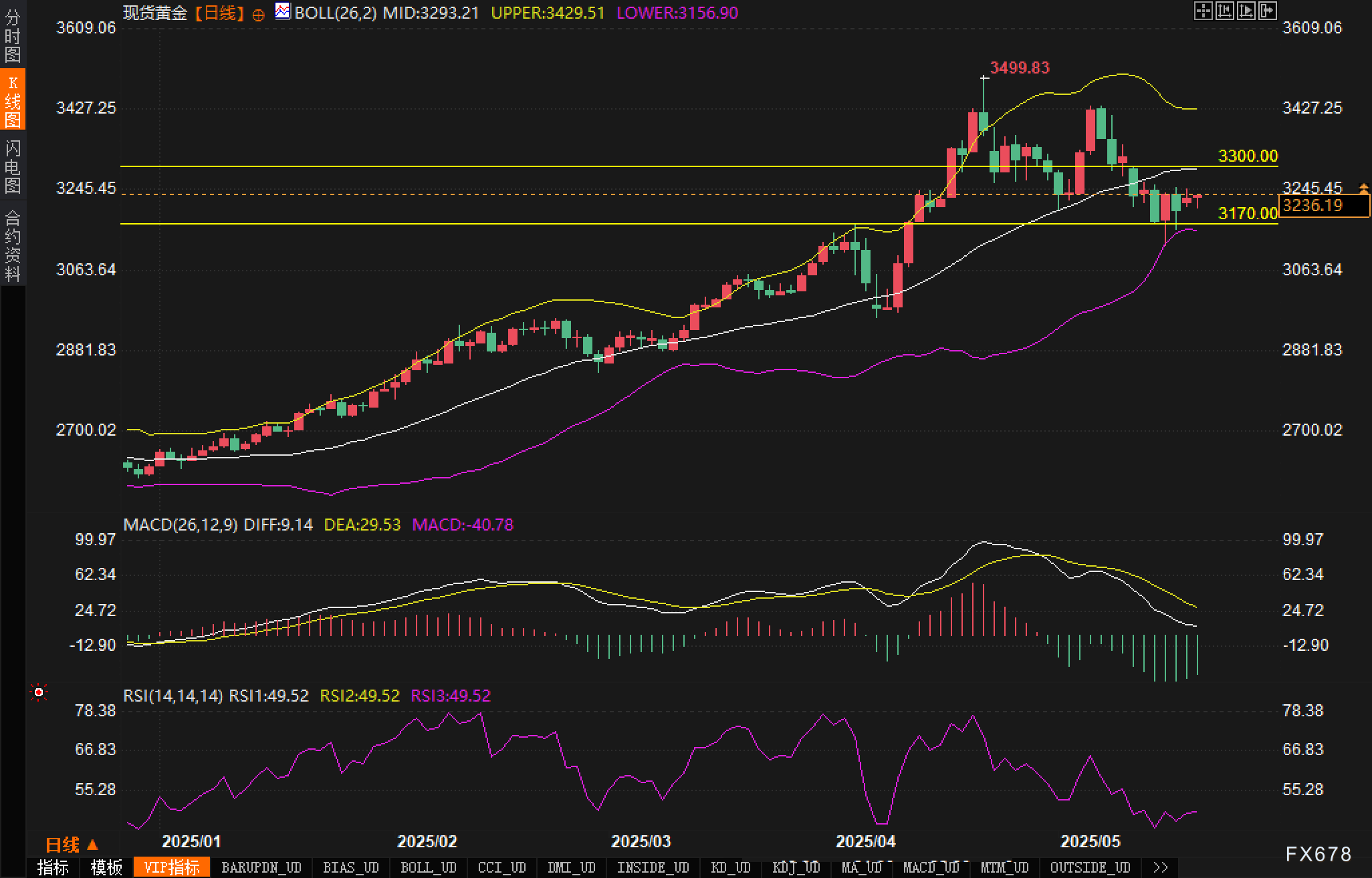 当前黄金技术形态呈现震荡整理格局,日线图显示价格正在测试下行趋势支撑,关键位置在3170.00美元附近。MACD指标显示负值-40.78,DIF与DEA均呈现下行走势,显示短期动能偏弱。RSI指标位于49.52水平,接近中性区域,表明市场多空力量相对均衡。