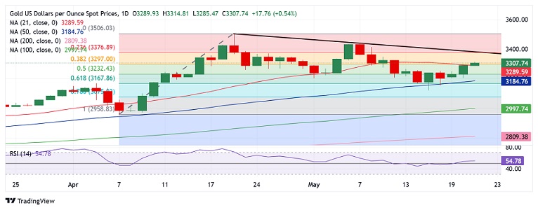 金价需要在日收盘时位于21日移动均线3289美元/盎司上方,以形成持续上升趋势。