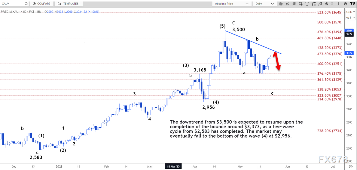 金价正处于c浪走势中,该浪已突破其100%预测位3286美元。未来可能进一步延伸至3337-3368美元区间。