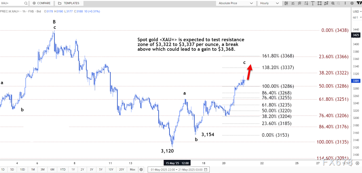 路透技术分析师指出,现货黄金预计将测试每盎司 3322-3337 美元的阻力区,突破该阻力区则可能上涨至 3368 美元。
