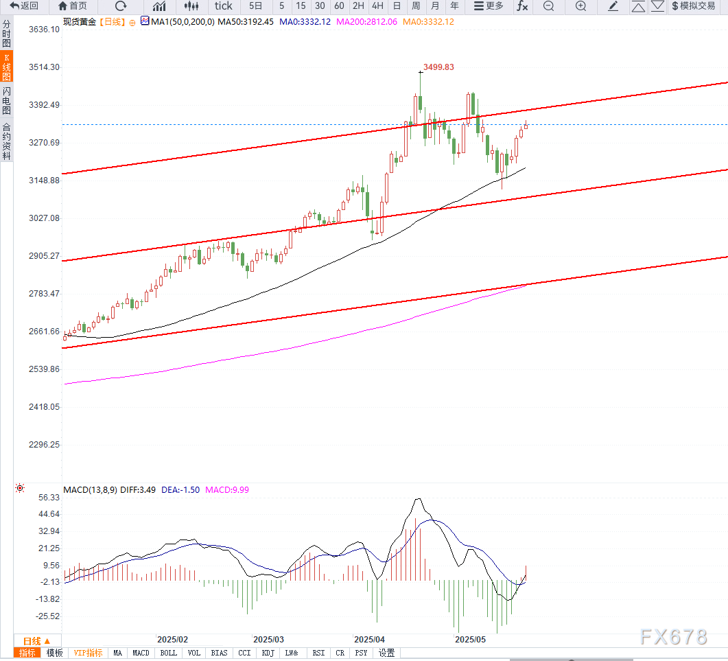 从技术面看,金价成功突破此前下跌走势的61.8%斐波那契回撤阻力位(约3315美元),并站稳在周初突破的3250-3255美元关键阻力带之上,显示多头主导行情。