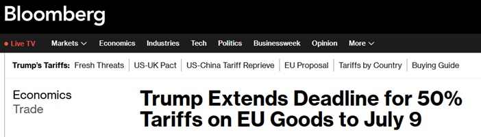 欧盟原本面对20%的对等关税,但特朗普4月宣布暂停征收对等关税至7月9日,让欧盟有时间与美国进行谈判。不过,特朗普上周五突然加大施压,批评与欧盟的谈判“毫无进展”,也重申欧盟占美国的便宜,威胁自6月1日起对所有欧盟输美产品征收50%的关税。