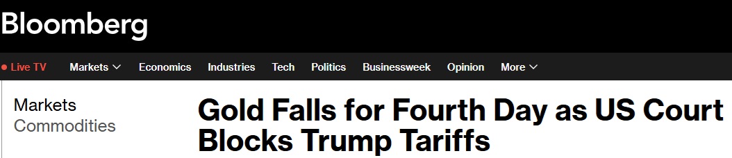 美国彭博社分析称,由于市场消化美国贸易法庭阻止特朗普全球关税议程的消息,黄金价格连续第四天下跌。此前三个交易日金价累计下跌2%。