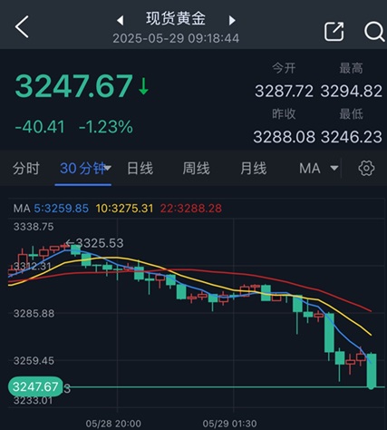 24K99讯 周四(5月29日)亚市早盘,现货黄金遭遇猛烈抛售,金价一度跌至3246美元/盎司附近,日内暴跌逾40美元。