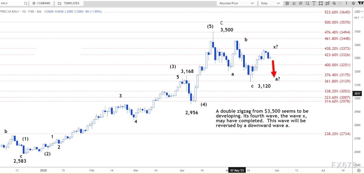 跌破 3284 美元将导致价格跌至 3234 美元至 3253 美元区间。日线图上,一个自 3500 美元开始的双锯齿形走势似乎正在形成。其第四浪,即 x 浪,可能已经完成。