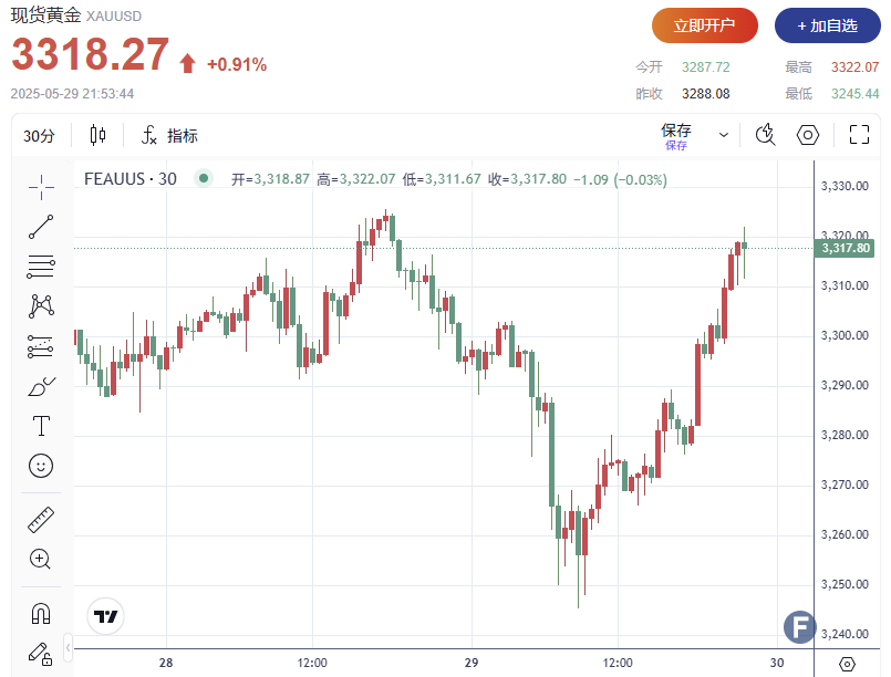 截至发稿,现货黄金价格上涨0.91%,报每盎司3318.27美元。欧亚时段曾触及5月20日以来最低点。