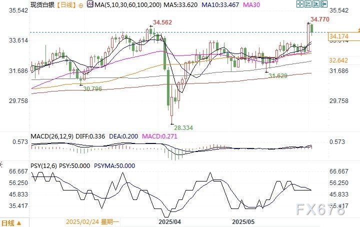 北京时间6月3日13:15 现货白银 报 34.174 美元/盎司